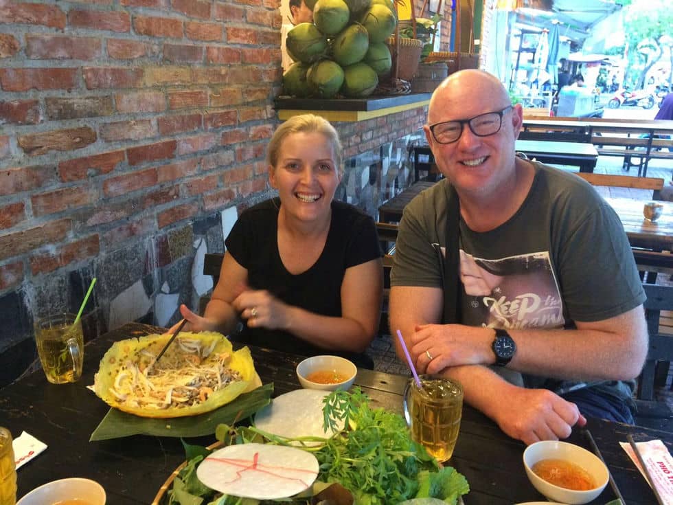 Tasting Banh Xeo - Vietnamese Pan-cake and Bo La Lot - Beef wrapped in Wild Betal Leaves and "bo la lot" with another kind of beer or other drink.